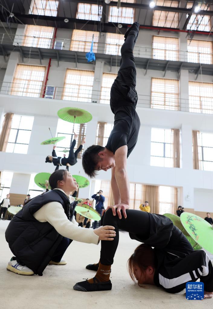 3月31日,演员们在位于江苏省盐城市建湖县的江苏省杂技团训练。