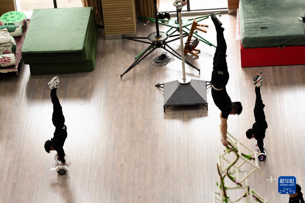 3月31日,演员们在位于江苏省盐城市建湖县的江苏省杂技团训练。