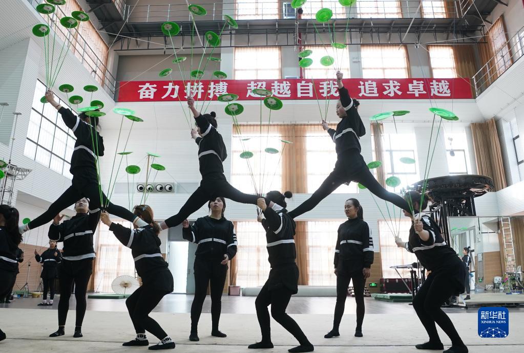 3月31日,演员在位于江苏省盐城市建湖县的江苏省杂技团训练。