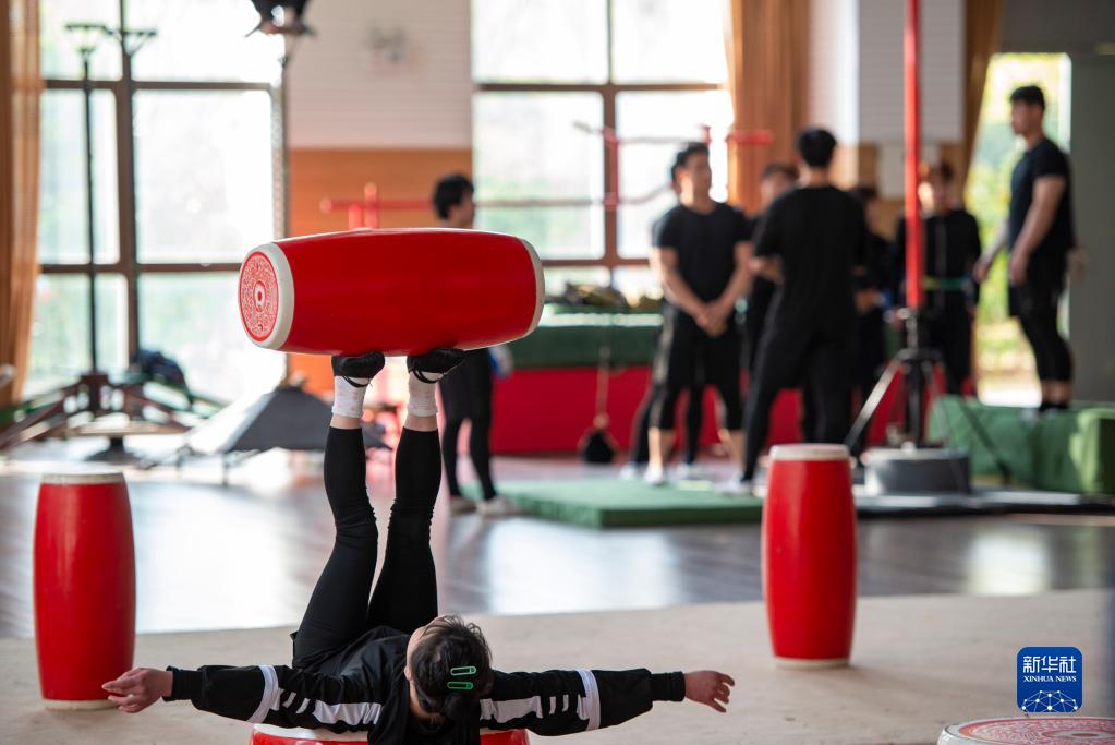 3月31日,演员在位于江苏省盐城市建湖县的江苏省杂技团训练。