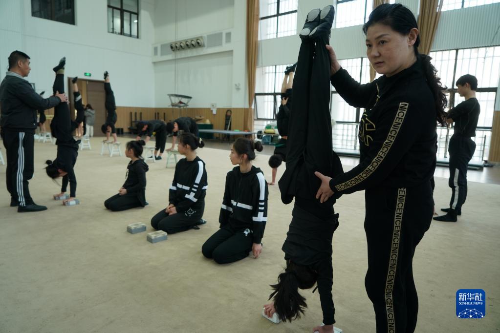 3月31日,演员在位于江苏省盐城市建湖县的江苏省杂技团训练。