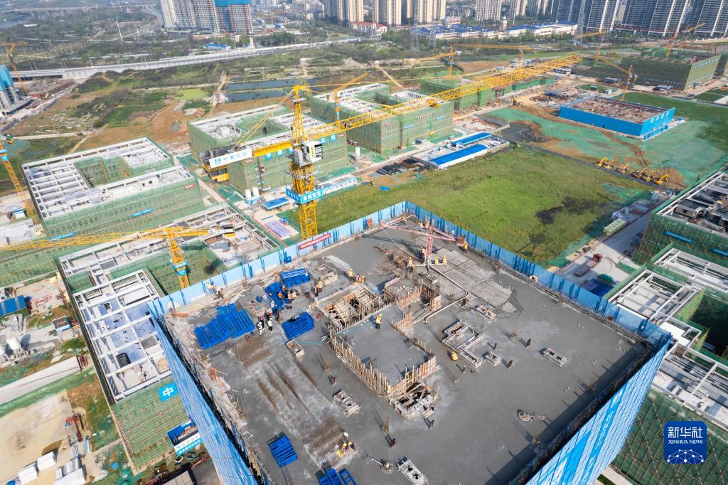 4月1日,在长沙岳麓山实验室集聚区农大片区项目建设现场,工人在进行封顶施工作业(无人机照片)。