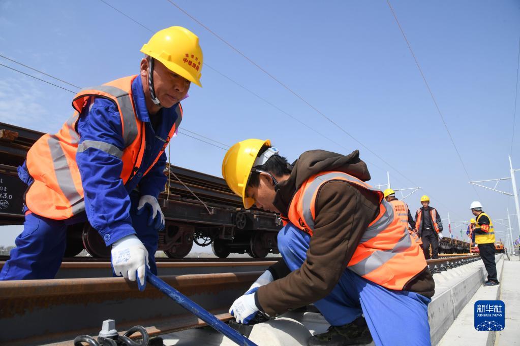 4月1日,中铁四局集团工作人员在莱荣铁路铺轨施工现场铺设轨道。