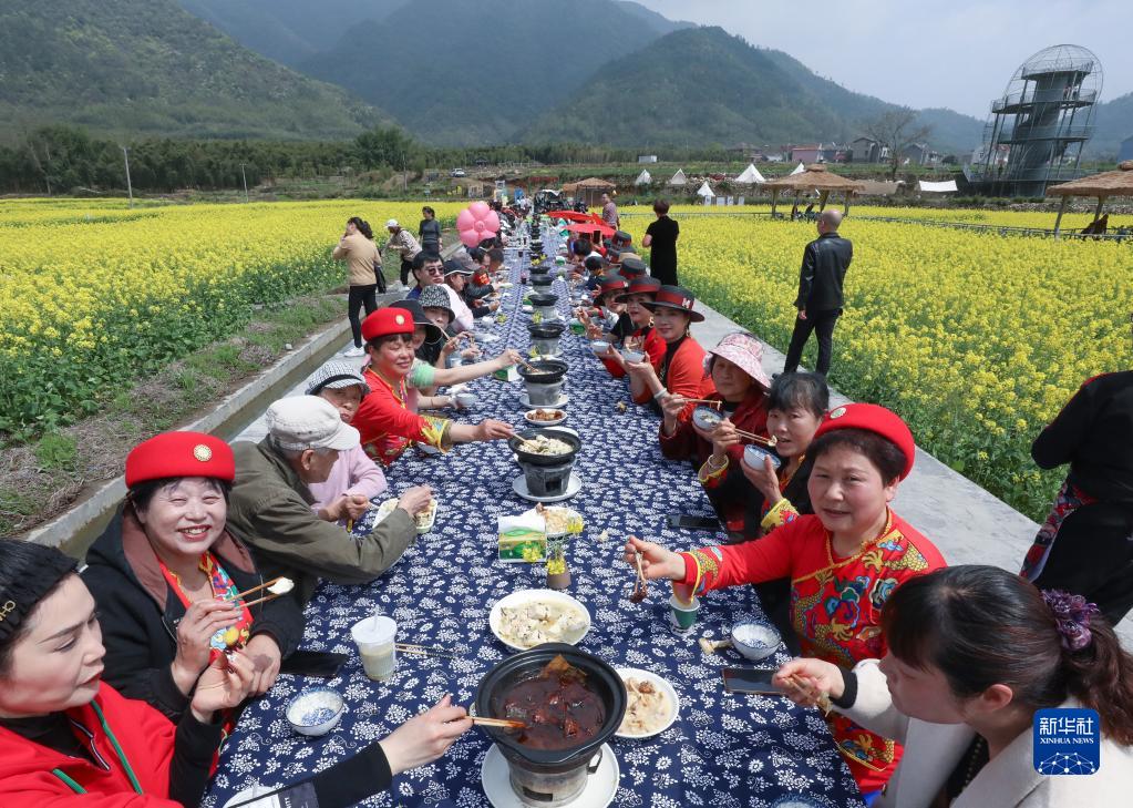 4月1日,游客在油菜花地里品尝乡间长桌宴。