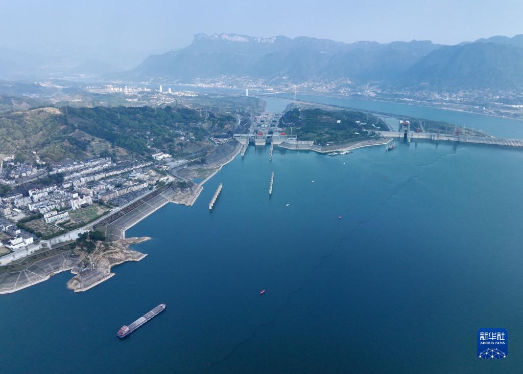 4月1日,船舶准备通过三峡双线五级船闸(无人机照片)。