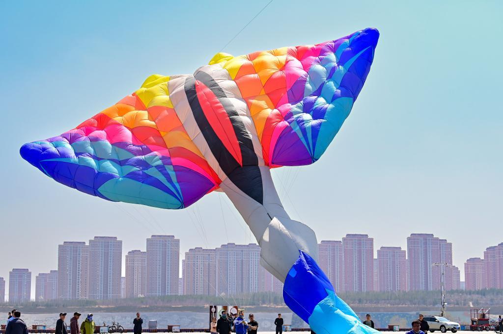 4月1日,风筝爱好者在康巴什区亚洲雕塑艺术主题公园放飞软体风筝。