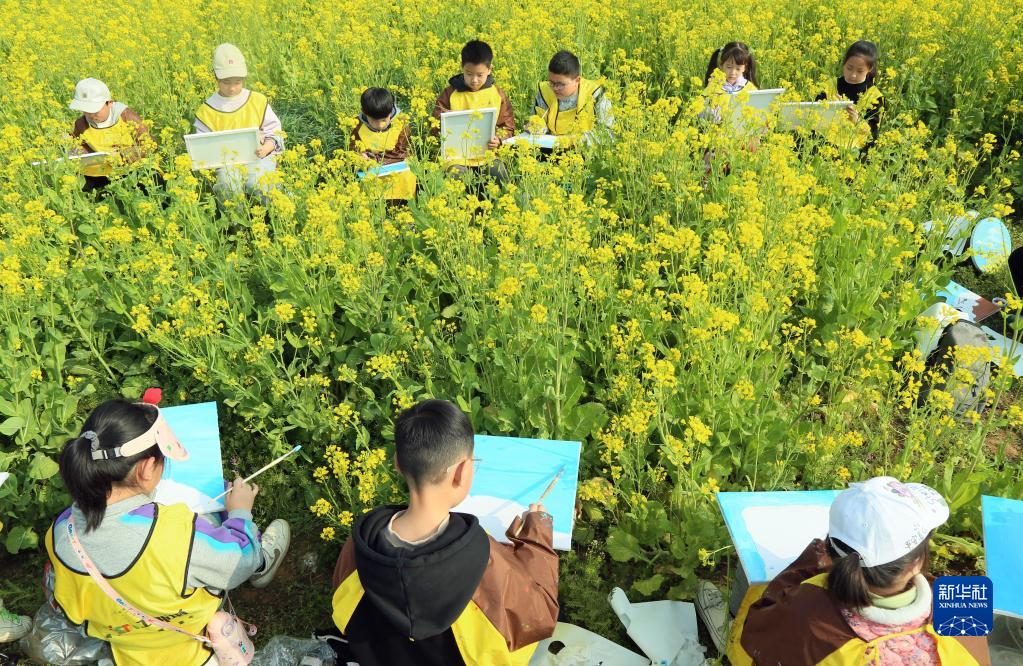 4月1日,在汝阳县三屯镇东保村千亩油菜花田,小学生坐在花丛中写生。