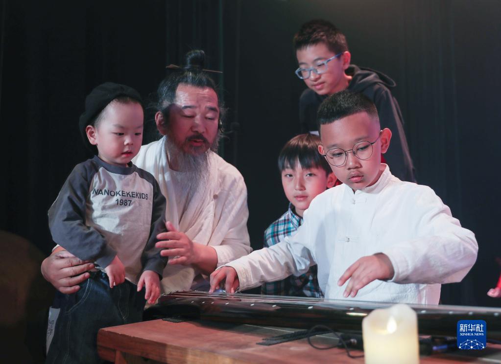 4月1日,小朋友在演出结束后体验古琴演奏。