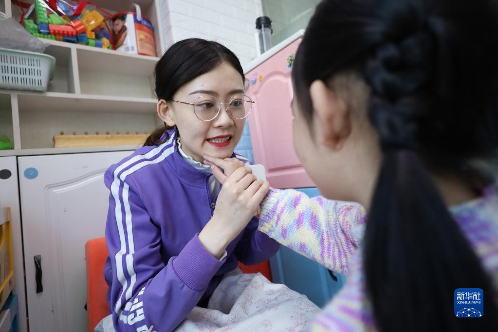 3月30日,特教老师陈进为孤独症儿童指导发音训练。