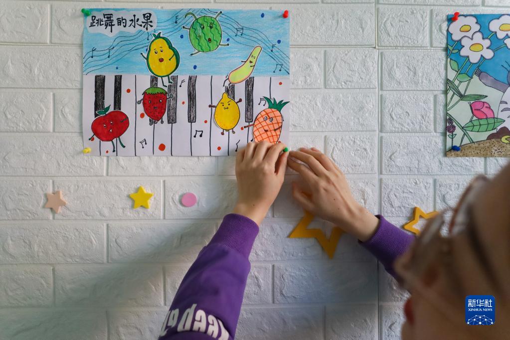 3月31日,特教老师陈进把孤独症儿童的绘画作品钉在墙上。