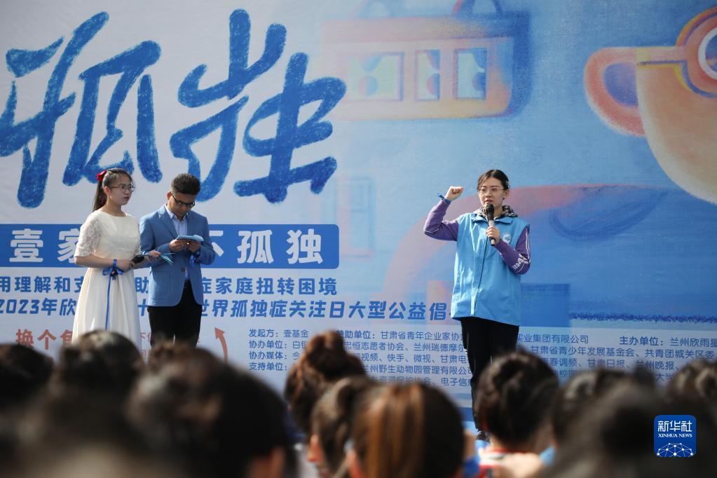 4月1日,特教老师陈进(右)在兰州一孤独症日公益活动上带领志愿者们宣誓。