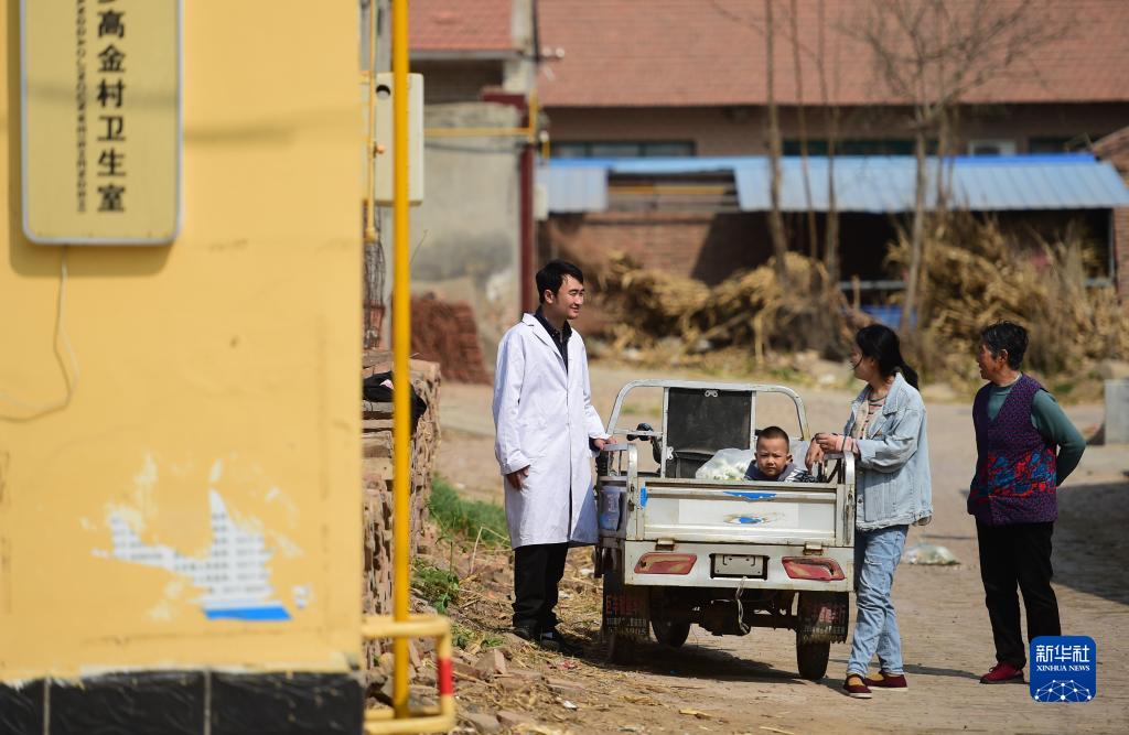 4月1日,盐山县孟店镇高金村大学生村医冯寿军(左一)向村民了解身体健康情况。