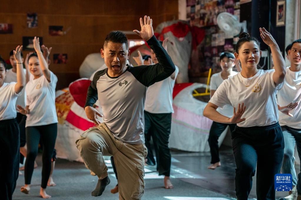 耿马县民族歌舞团团长王峰(前左)在练功房和演员们一起练习耿马傣族古乐舞(3月23日摄)。