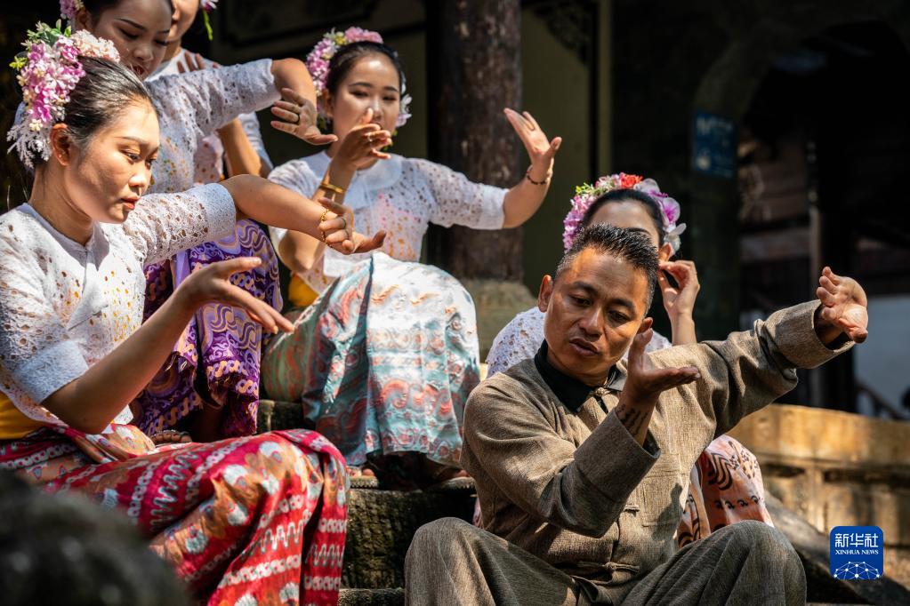 耿马县民族歌舞团团长王峰(右下)在和演员们交流舞蹈动作(3月23日摄)。