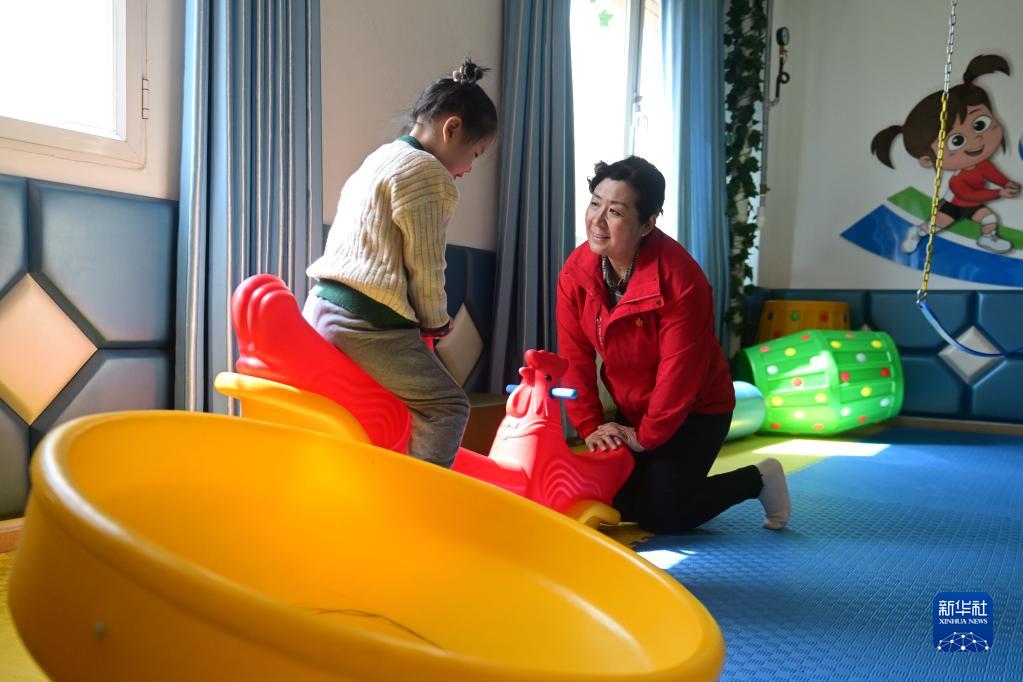 3月30日,在青海省西宁市星光特殊儿童服务中心,陈志芳(右)给孤独症儿童做运动训练。