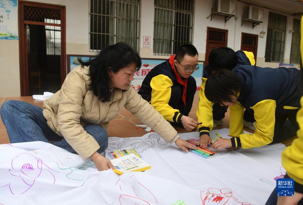 在广西南宁高新区龙华学校,何冬艳教孤独症学生画画(3月31日摄)。