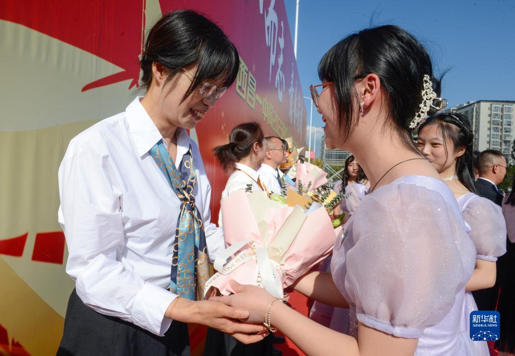 4月2日,在西昌一中成人礼上,高三学子向老师献花。