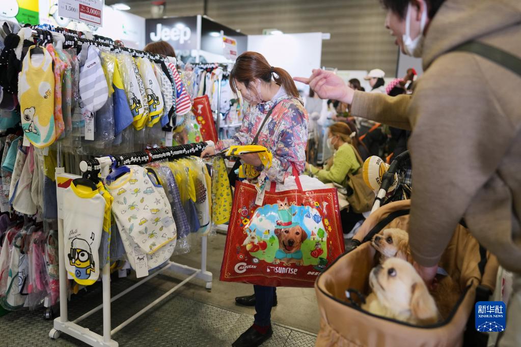 4月2日,人们带着宠物在日本东京国际宠物用品博览会上选购商品。