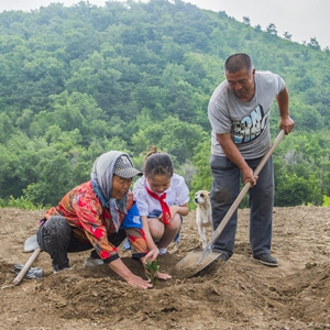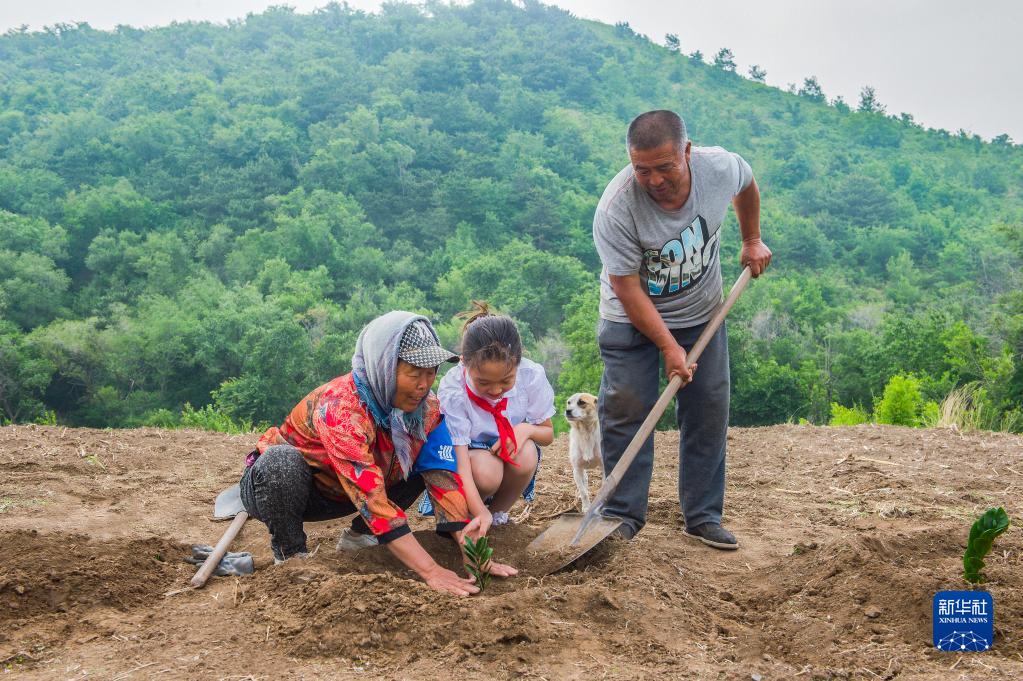 田万贵、陆敏夫妇和小朋友在辽宁省凌海市翠岩镇前田屯村“鹭岭”植树(2022年6月3日摄)。