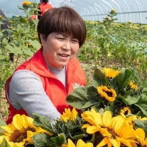 4月2日,在江苏省海安市大公镇仲洋村向日葵种植基地,农民采割向日葵花。