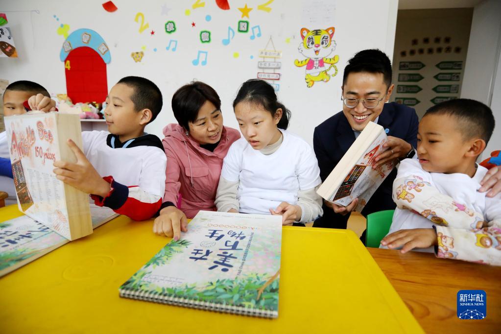 4月2日,在关注“星星的孩子”公益捐助活动上,工作人员为孩子们赠送画笔和画本。