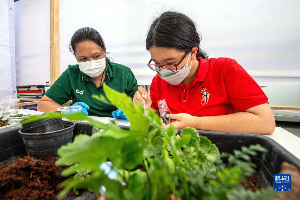 4月2日,在位于曼谷的泰国孤独症职业中心,一名孤独症患者(右)学习制作绿植盆景。