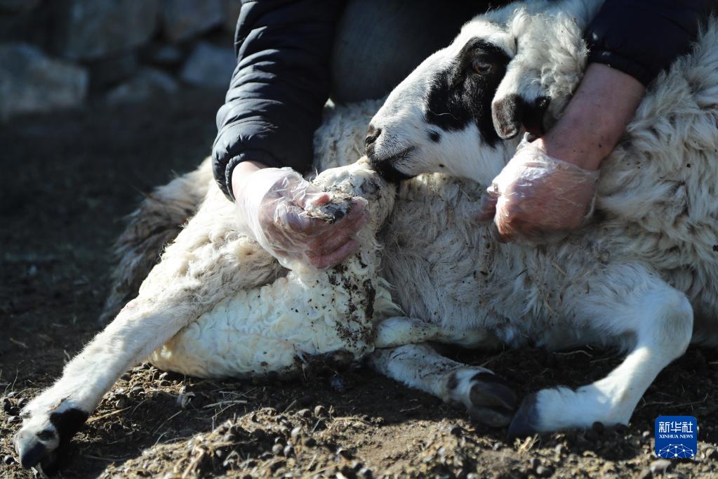 3月29日,朝克德力根帮助母羊熟悉新生羊羔的气味。