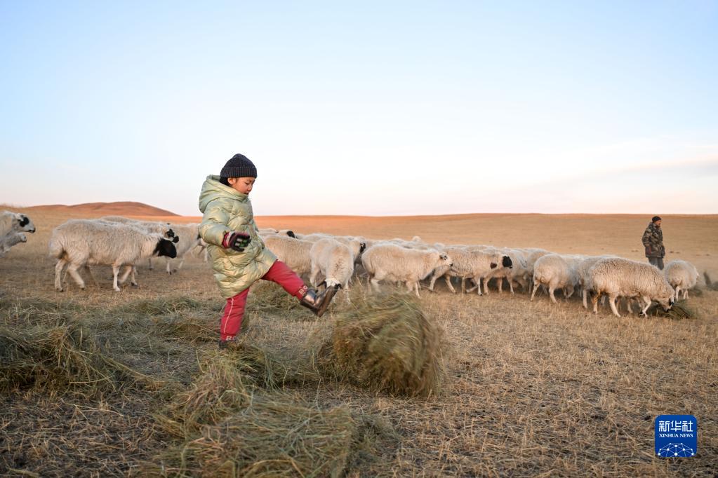 3月29日清晨,朝克德力根的女儿在草场上踢草垛。这是为了让牧草更加分散,方便羊群进食。