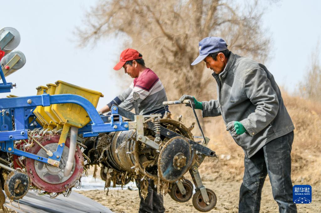 在新疆尉犁县,棉农在调试播种机(3月30日摄)。