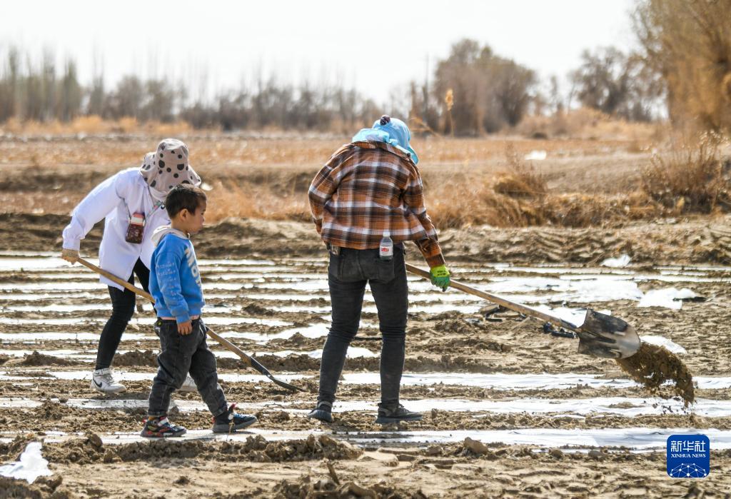 在新疆尉犁县,棉农在地膜上补土(3月30日摄)。