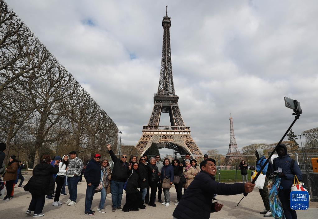 4月3日,游客在法国巴黎埃菲尔铁塔附近拍照留念。