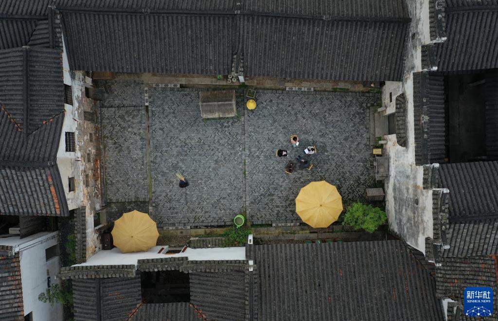 4月3日,几名老街青年创客聚集在姜鹏工作室交流心得体会(无人机照片)。新华社记者 翁忻旸 摄