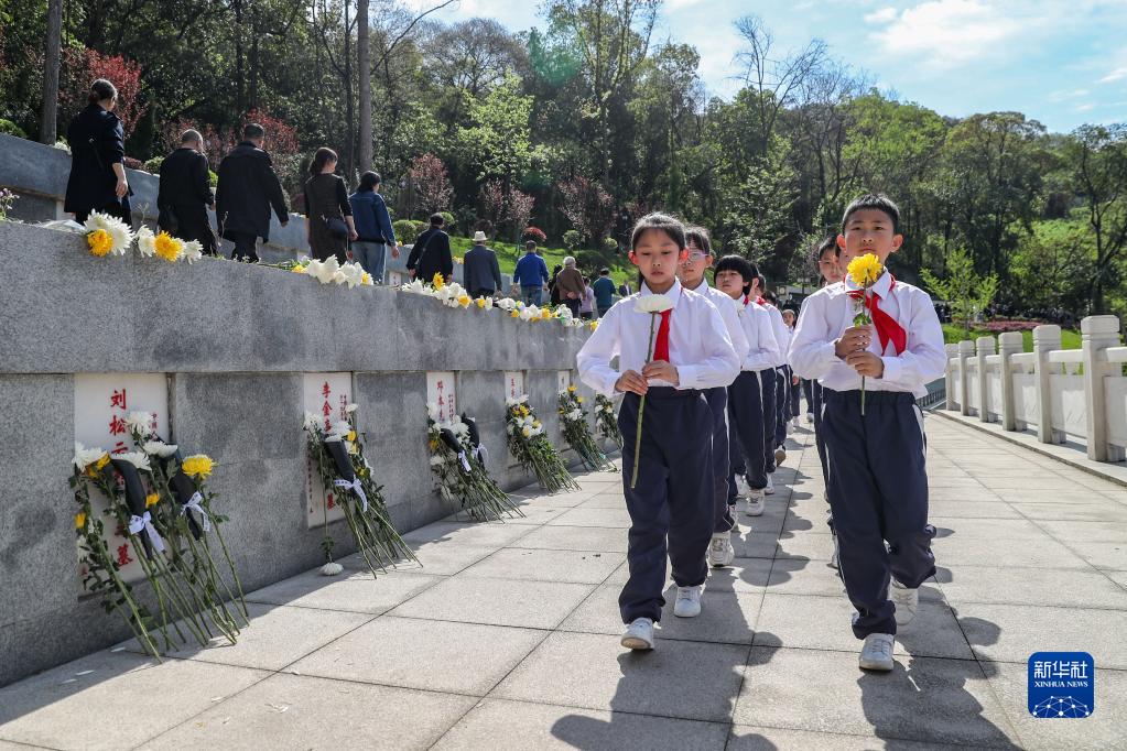 4月4日,少先队员在四川省宜宾市烈士陵园缅怀革命先烈。
