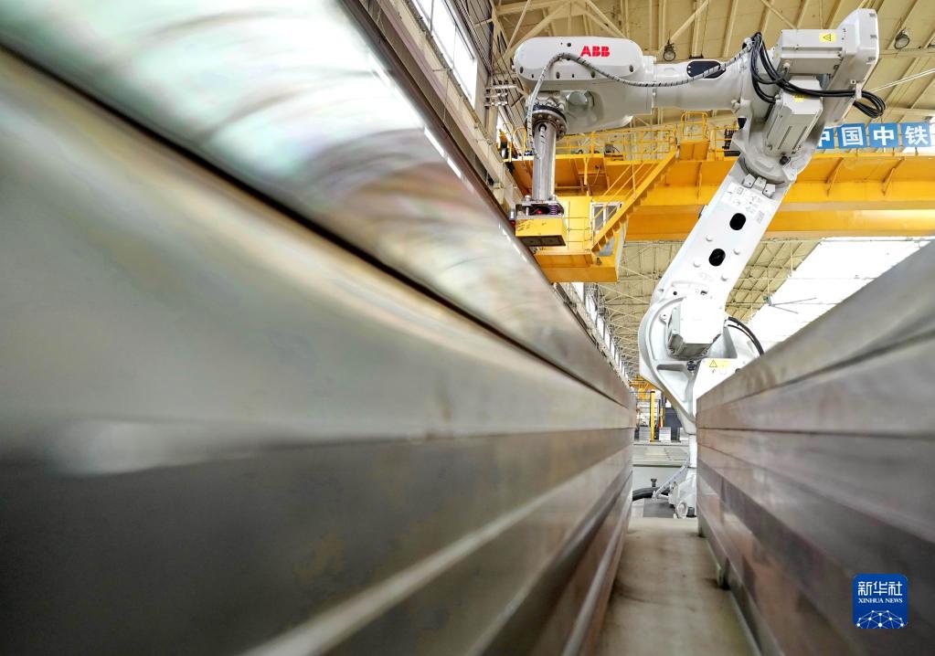 4月4日,秦皇岛市山海关区中铁山桥集团有限公司高速道岔垫板生产线上的机器人在工作中。