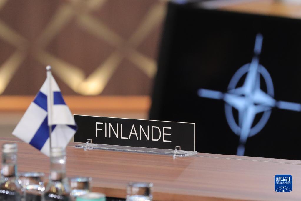 这是4月4日在比利时布鲁塞尔的北约总部拍摄的芬兰桌牌和北约标识。