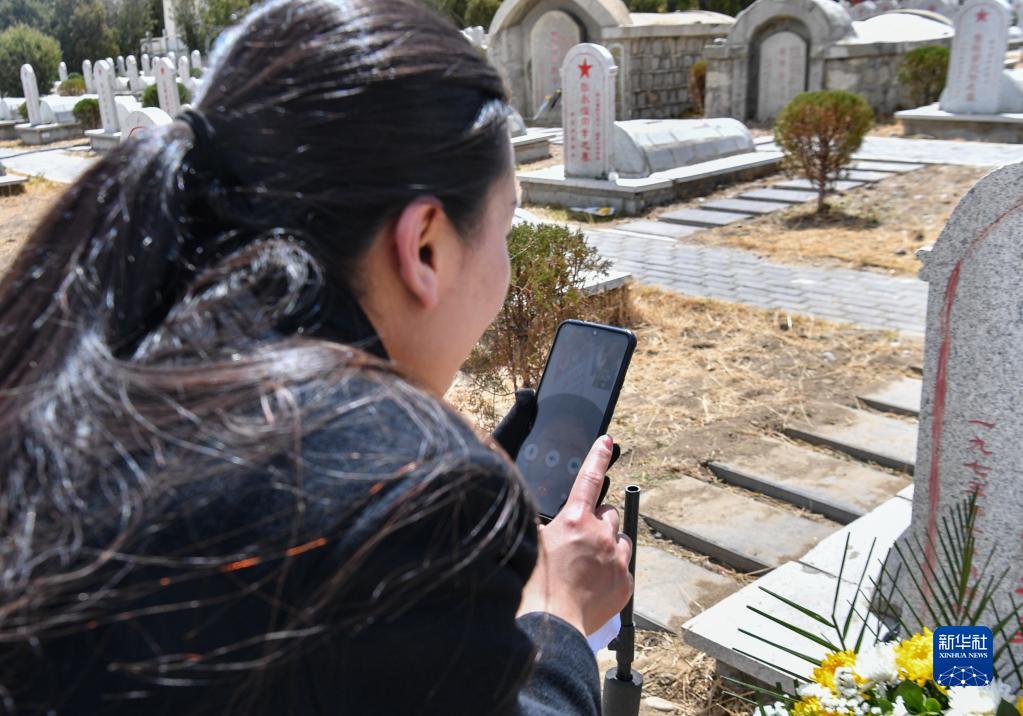 在拉萨烈士陵园,索朗拉姆和无法前来扫墓的烈士家属视频通话,代为祭拜(4月5日摄)。