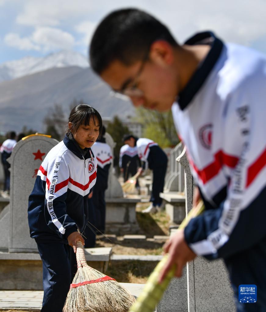 学生在拉萨烈士陵园扫墓(4月5日摄)。