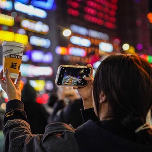 4月4日,游客们手拿咖啡在延吉市打卡拍照。
