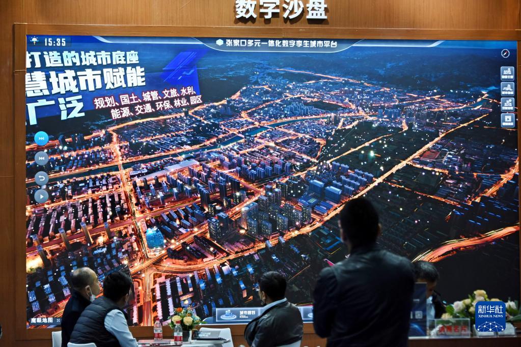 4月6日,参观者在展会上体验数字沙盘。