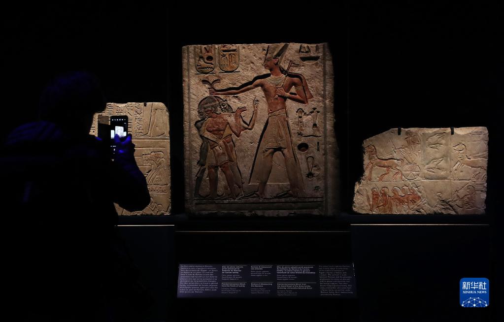 4月6日,媒体记者在法国巴黎参观“拉美西斯和法老的黄金”埃及文物展。