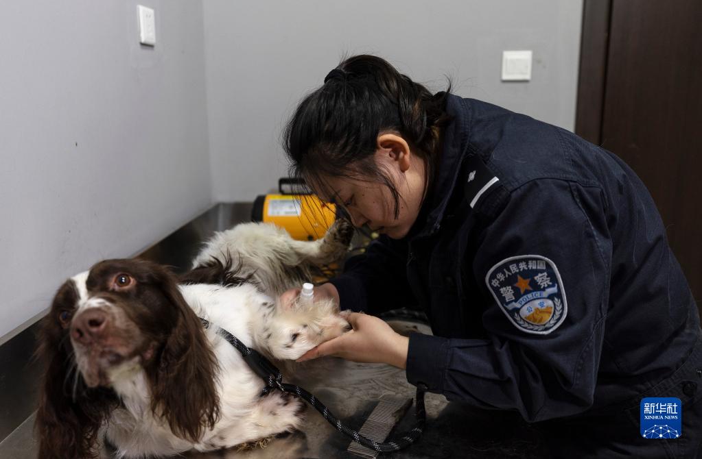 4月3日,刘欣给警犬康欣脚上的伤口抹药。新华社记者 费茂华 摄