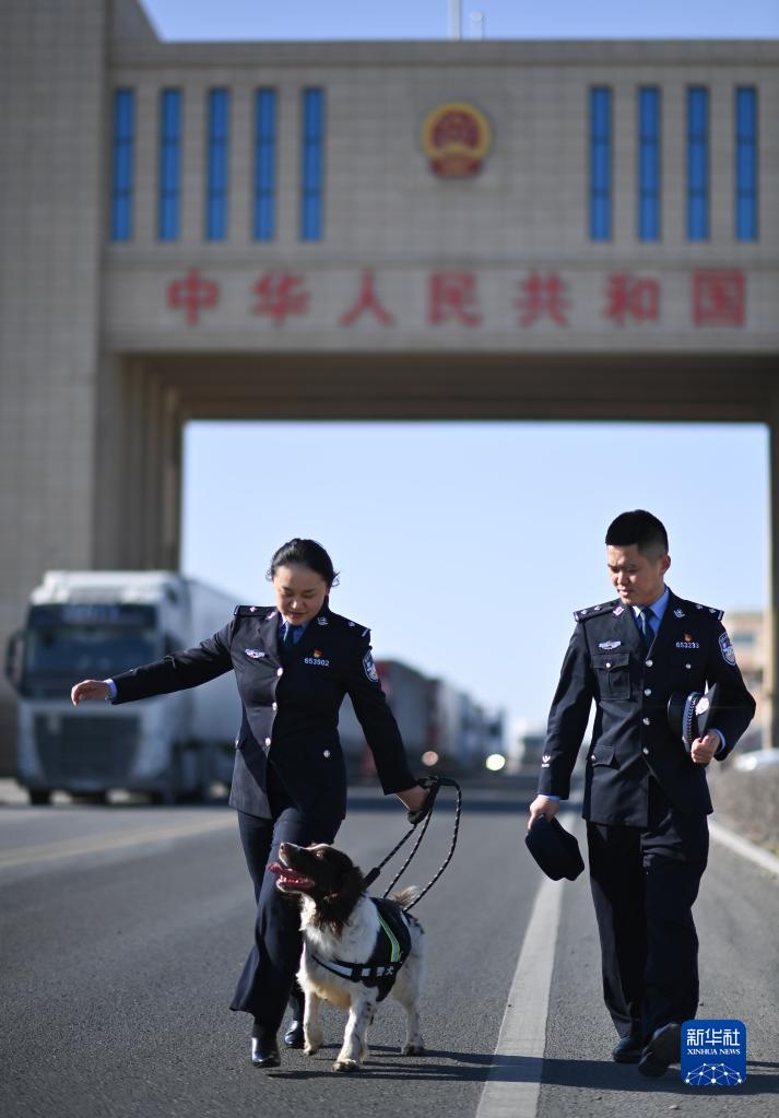 4月3日,崔洪武(右)、刘欣和警犬康欣走过阿拉山口国门。新华社记者 李响 摄