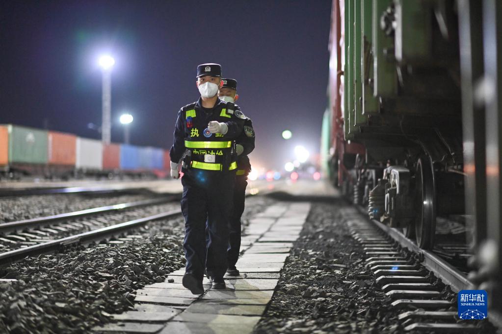 4月4日,崔洪武(前)和同事列队前往执勤现场。新华社记者 李响 摄