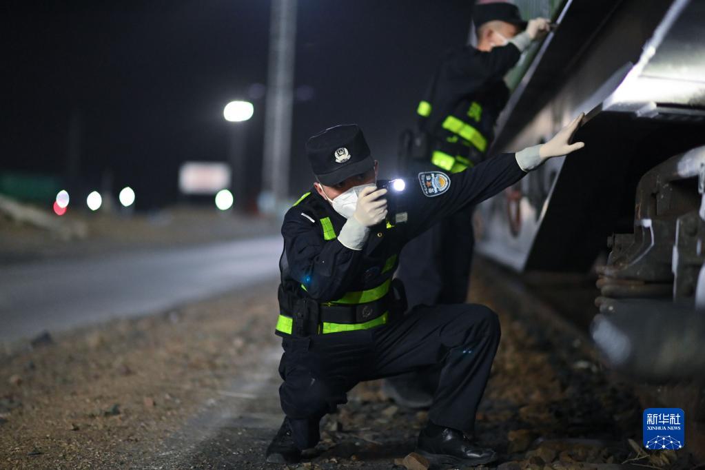 4月4日,崔洪武(前)和同事进行车体查缉工作。新华社记者 李响 摄
