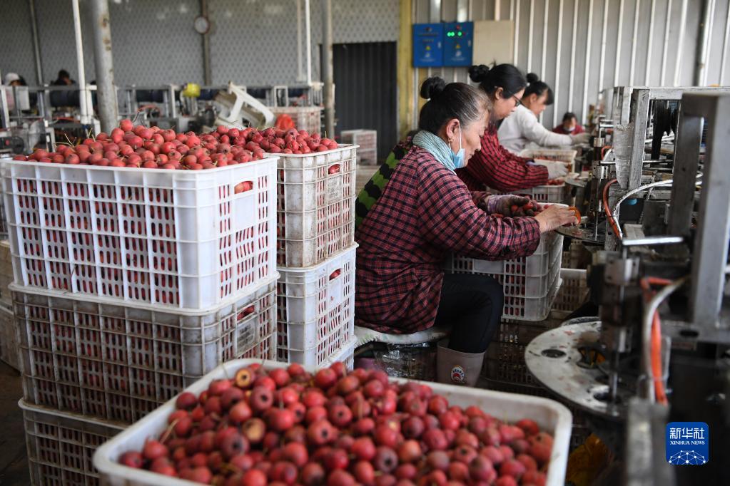 4月6日,在天津市蓟州区下营镇野森家庭农场,工人对山楂进行初加工。