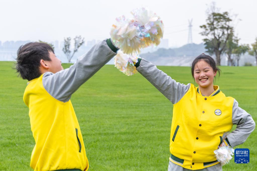3月31日,在重庆广阳岛,重庆市特殊教育中心的视力障碍学生在草坪上跳操。