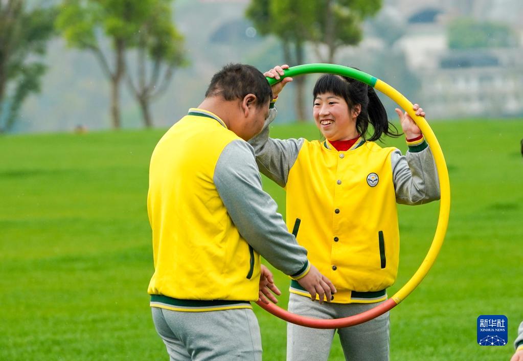 3月31日,重庆广阳岛的一片草地上,重庆市特殊教育中心视力障碍学生们在玩呼啦圈。