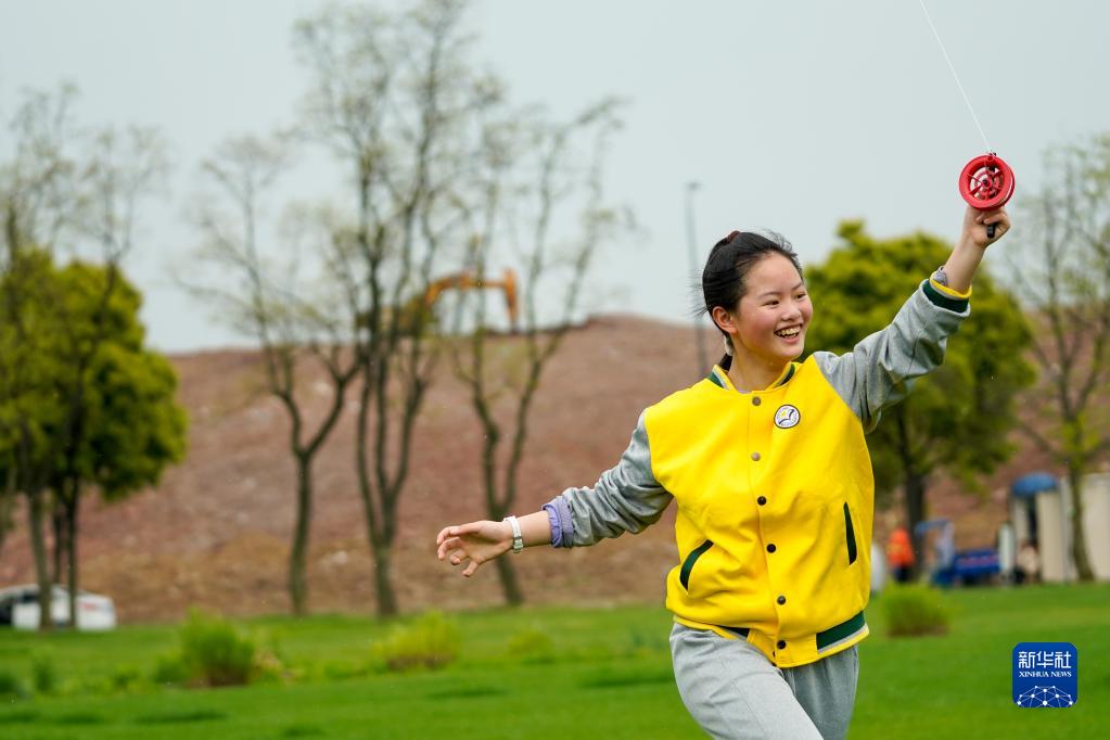 3月31日,一名重庆市特殊教育中心视力障碍学生在广阳岛的草地上放风筝。