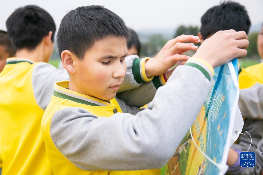 3月31日,在重庆广阳岛,重庆市特殊教育中心的视力障碍学生在草坪上触摸风筝。