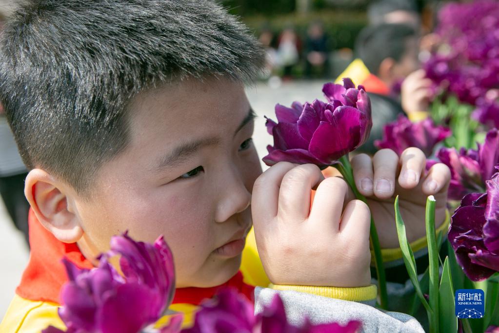 3月14日,重庆市特殊教育中心的视力障碍学生在重庆市南山植物园轻轻触摸花朵。